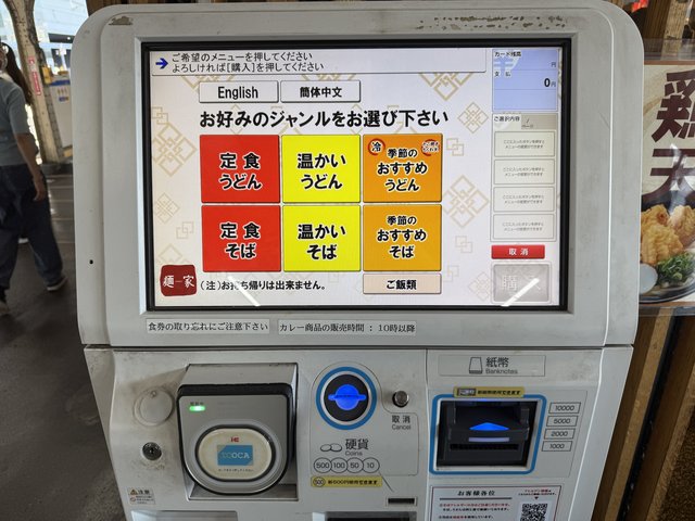 店頭の券売機で食券を購入し、店内へ。L字カウンターのみのスタンド席のみで、水はセルフサービス。現金のほか、ICOCAも利用可能です。