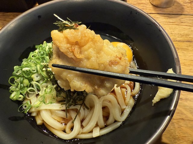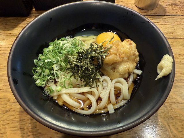 この日は夏らしく「ぶっかけ」を讃岐うどんに変更し、鶏天ぷらと生卵をトッピング。他にもトッピング具材が色々とあり、カスタマイズもでき、たっぷり添えられたおろし生姜も嬉しいポイントです。
