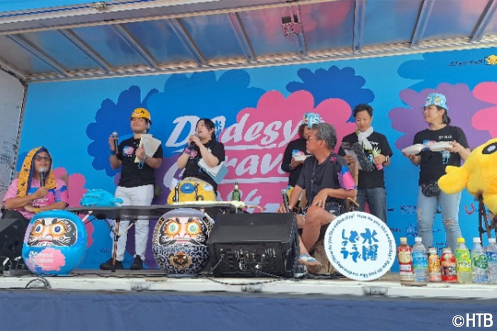 ディレクター陣のトークショーをはじめ、その土地ならではの物産PRや催し物、出店が楽しめるほか、どうでしょうファンのミュージシャンによるステージやグッズ販売、縁日、くじ引きなど、見て、聞いて、楽しめます。