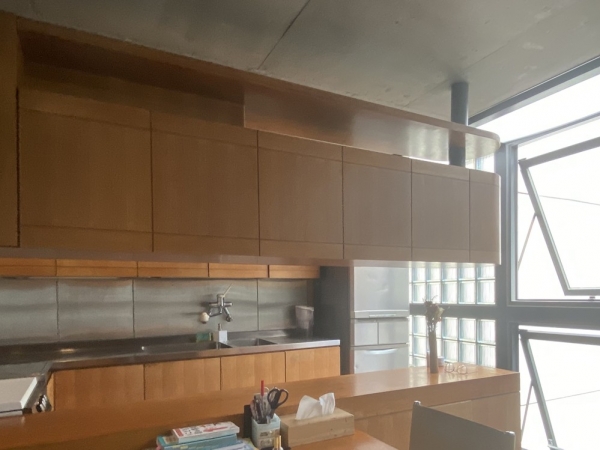 造りつけの木製家具の美しさにも心を奪われた。特にキッチンまわりの収納やテーブルは、本格的なバーのよう。安藤氏は建築家として無名の頃、飲食店を数多く設計していたので、こういう造作がとてもうまい。
