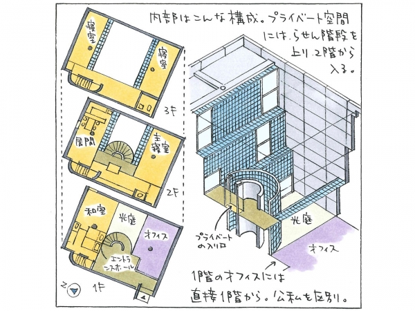 「ガラスブロックの家」という名前から、外観がガラスブロックでぐるっと覆われた家を想像していた人は、「えっ」と思う。外観には1枚のガラスブロックもない。それどころか、窓もほとんどない。地上3階建ての建物の四周がコンクリート打ち放しの壁でがっつり囲まれている。なんとも無機的な外観だ。
