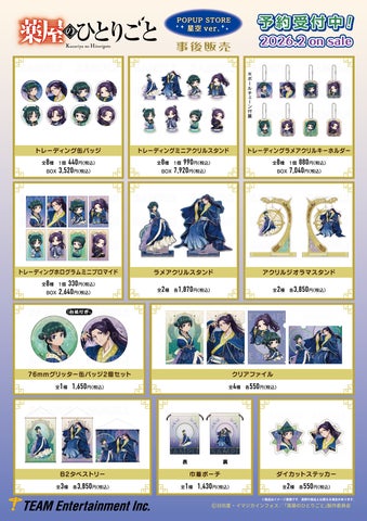 TVアニメ『薬屋のひとりごと』星空ver.オリジナルグッズは、ティームエンタテインメントECサイト「ティームストア」や全国のグッズ・ホビー取扱いショップ等で予約を受け付けています。詳細情報や購入手続きは、以下の公式ページをご覧ください。