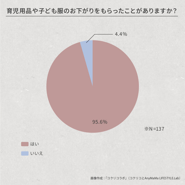 子育て中のパパママに、育児用品や子ども服のお下がりをもらった経験があるか聞いたところ、95.6%が「はい」と回答しました。ほとんどの方が、お下がりをもらった経験があることがわかります。