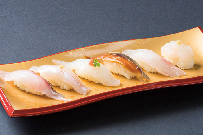 こちらは「能登いか」「へしこ」「白海老」のレギュラーネタに、その日揚がったオススメの北陸ネタ3貫が入る6貫盛りです。