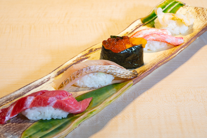 「トロ(マグロ)」「のどぐろ」「うにいくら」「紅ズワイガニ」「貝類」の5貫盛りです。