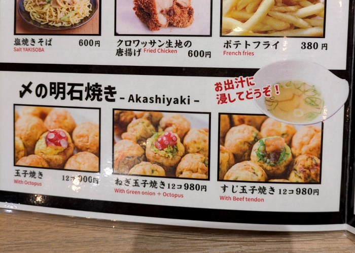 さらにページをめくると「〆(シメ)の明石焼き」だって!? 明石焼きはシメに食うものなのか? たこ焼きを出汁に入れるものだと思ったら、こっちは「玉子焼き」って書いてある。たこ焼きじゃないのか!? たこ焼きと玉子焼きの違いがわからん……。