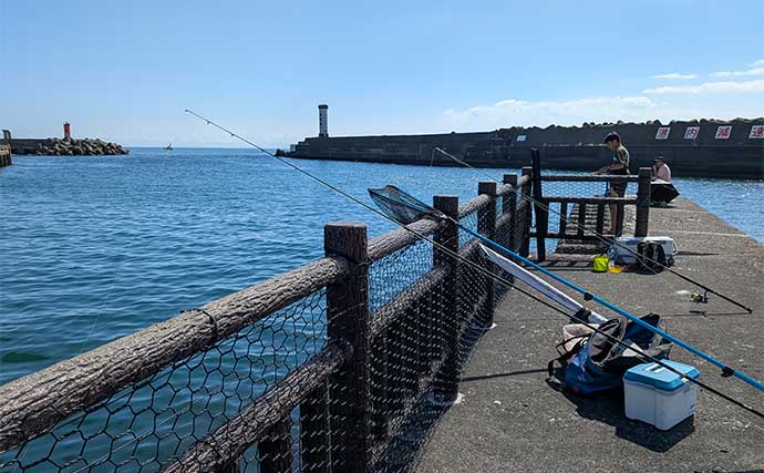 干潮近くなって、岸壁沿いは岩が露出している。周辺にはトウゴロウイワシの群れが確認できる。それを狙っているダツやショゴ、カマスらしき魚影も見える。柵沿いには、アジの切り身エサでブッコミ釣りをしている人も。