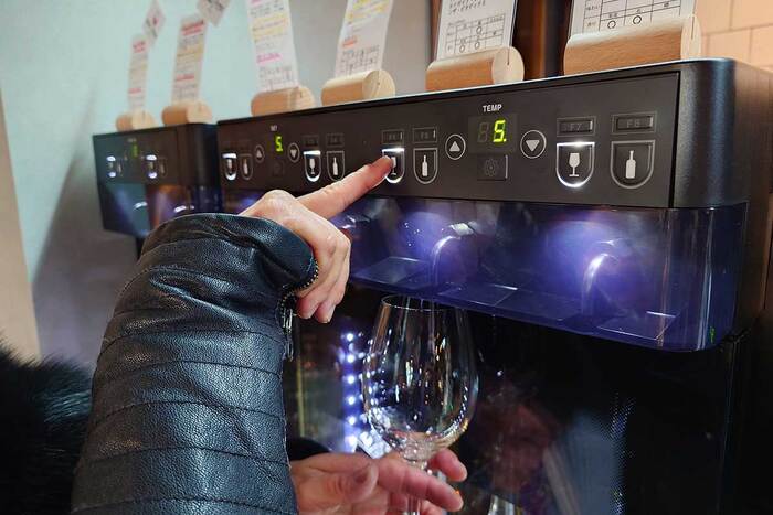 お好みのワインの注ぎ口にワイングラスを持ってきて、白く光るグラスワインボタンを押します。