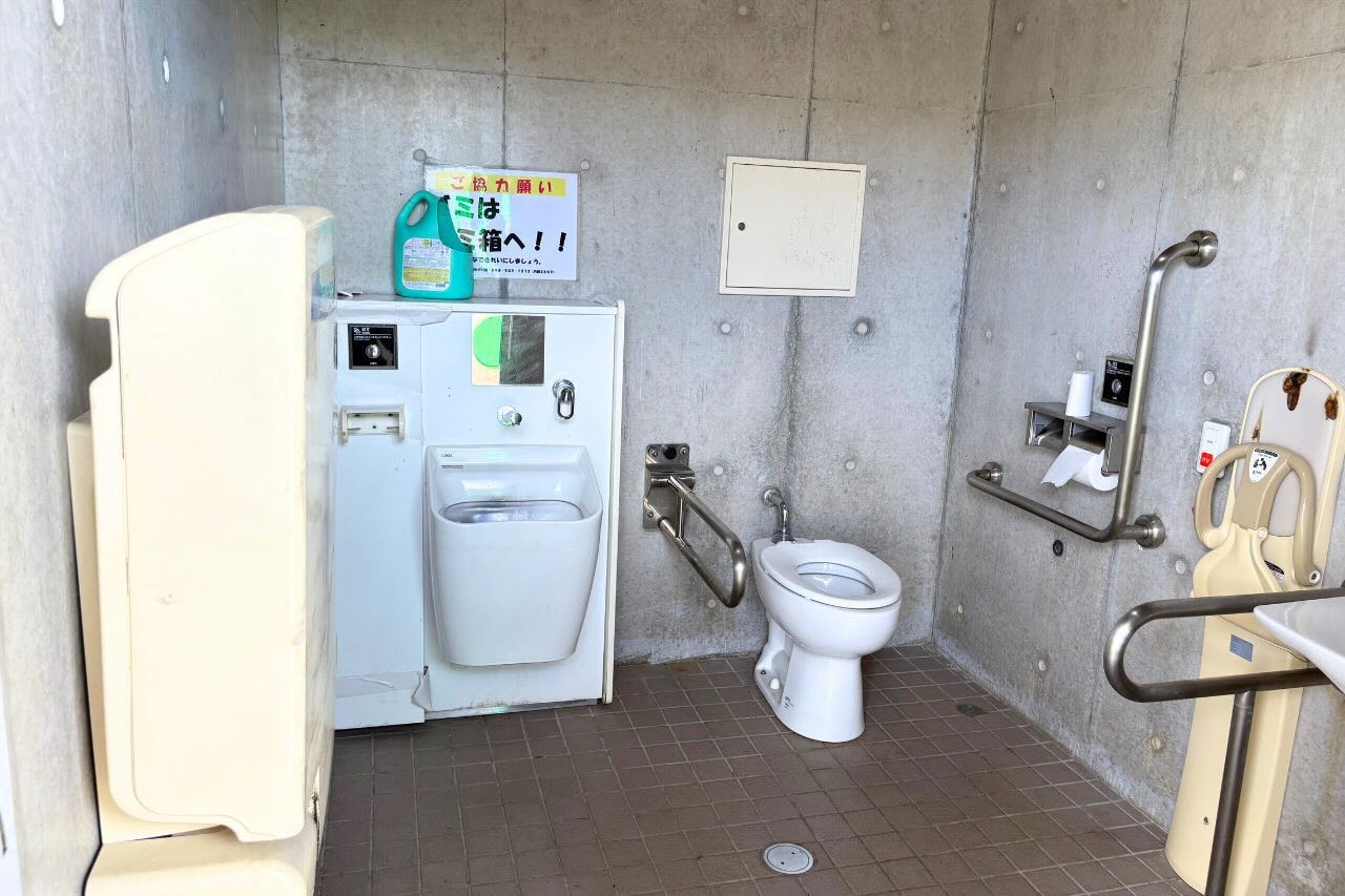 広い若夏公園には駐車場側にトイレがあります。男性用女性用のほかに、障がい者用トイレもあり、おむつ替え用のベットも完備しています。