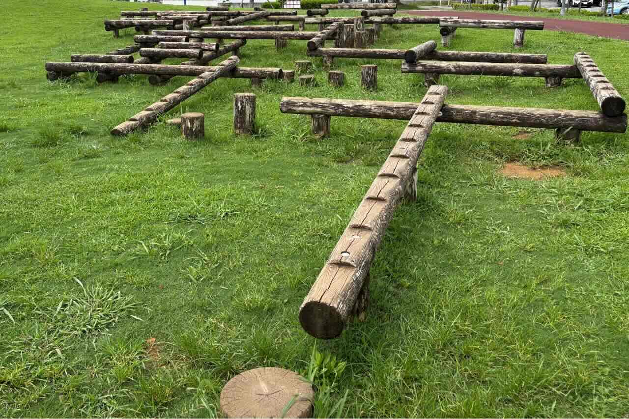 縦横無尽に組まれた丸太の一本橋では、ジャンケンしながら落ちないように小走りに渡り歩く子どもたちの姿も。シンプルながらバランス感覚がかなり鍛えられる大人も楽しい遊具です。