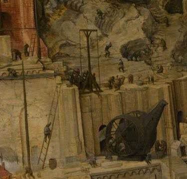 絵をよく見ると、高層建築に必要な巻き上げ機や滑車など、様々な機材が描かれています。塔の各層に取り付けられたクレーンは、当時の建設現場で使用されたものです。ブリューゲルが暮らしていた時期、アントワープは建設ラッシュでした。現場を訪れ、最新の機材や道具、作業方法などをスケッチし、制作に活用したと考えられます。
