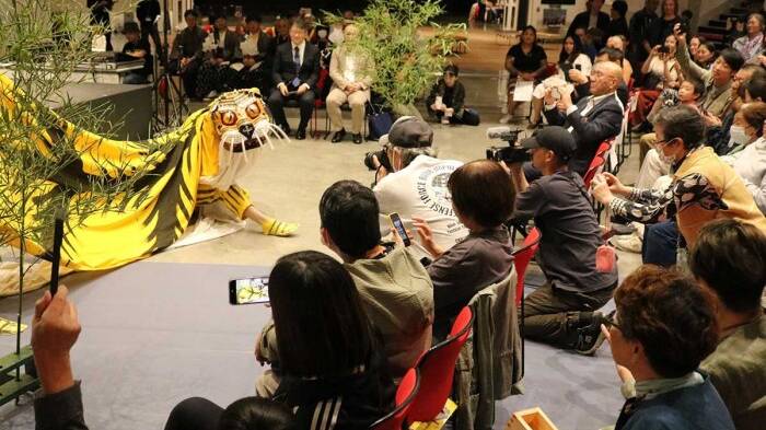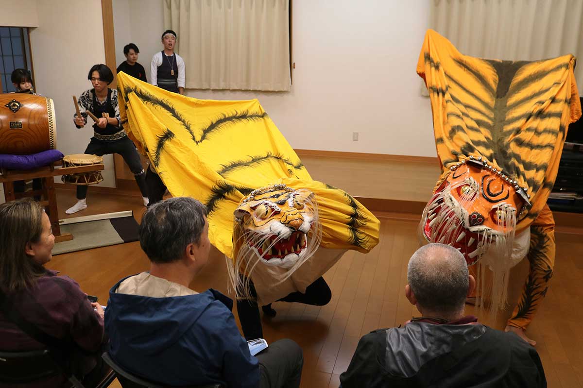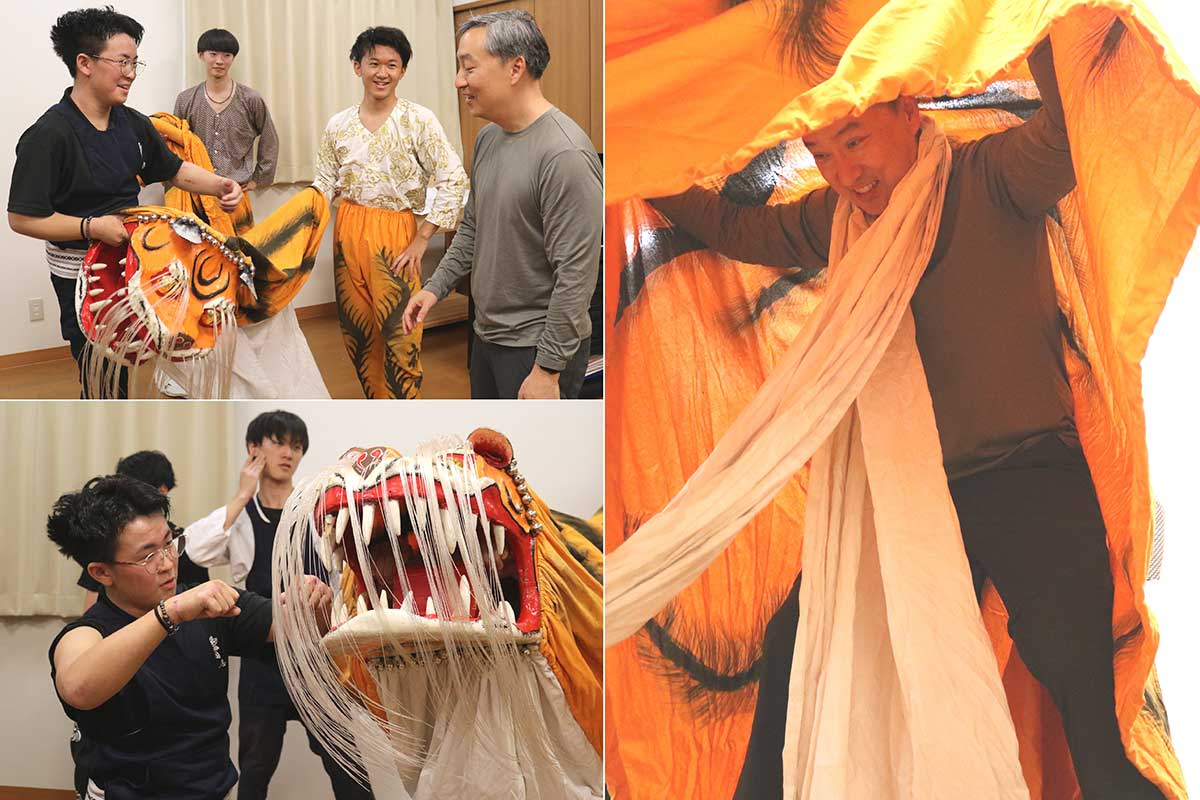 演舞の後は体験コーナー。外国人客は囃子の一節を太鼓で叩いたり、虎頭を動かしてみたりと初めての体験を楽しんだ。生徒らは覚えている英単語と身ぶり手ぶりで、道具の使い方を教え、地域の芸能の魅力を発信した。