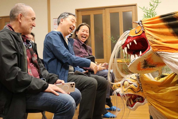 郷土芸能「虎舞」を通じた地元高校生と外国人観光客の交流会が10日、釜石市箱崎町の箱崎集会所で開かれた。虎舞を披露したのは、郷土芸能の担い手不足解消をテーマに研究する釜石高2年のゼミグループメンバーを中心とした有志11人。同市の観光地域づくり法人かまいしDMCの企画に協力した。「みちのく潮風トレイル」を目的にハワイから来日した3人に演舞を披露。お囃子(はやし)や虎の頭(かしら)を操る体験もしてもらい、郷土色豊かな国際交流が繰り広げられた。
