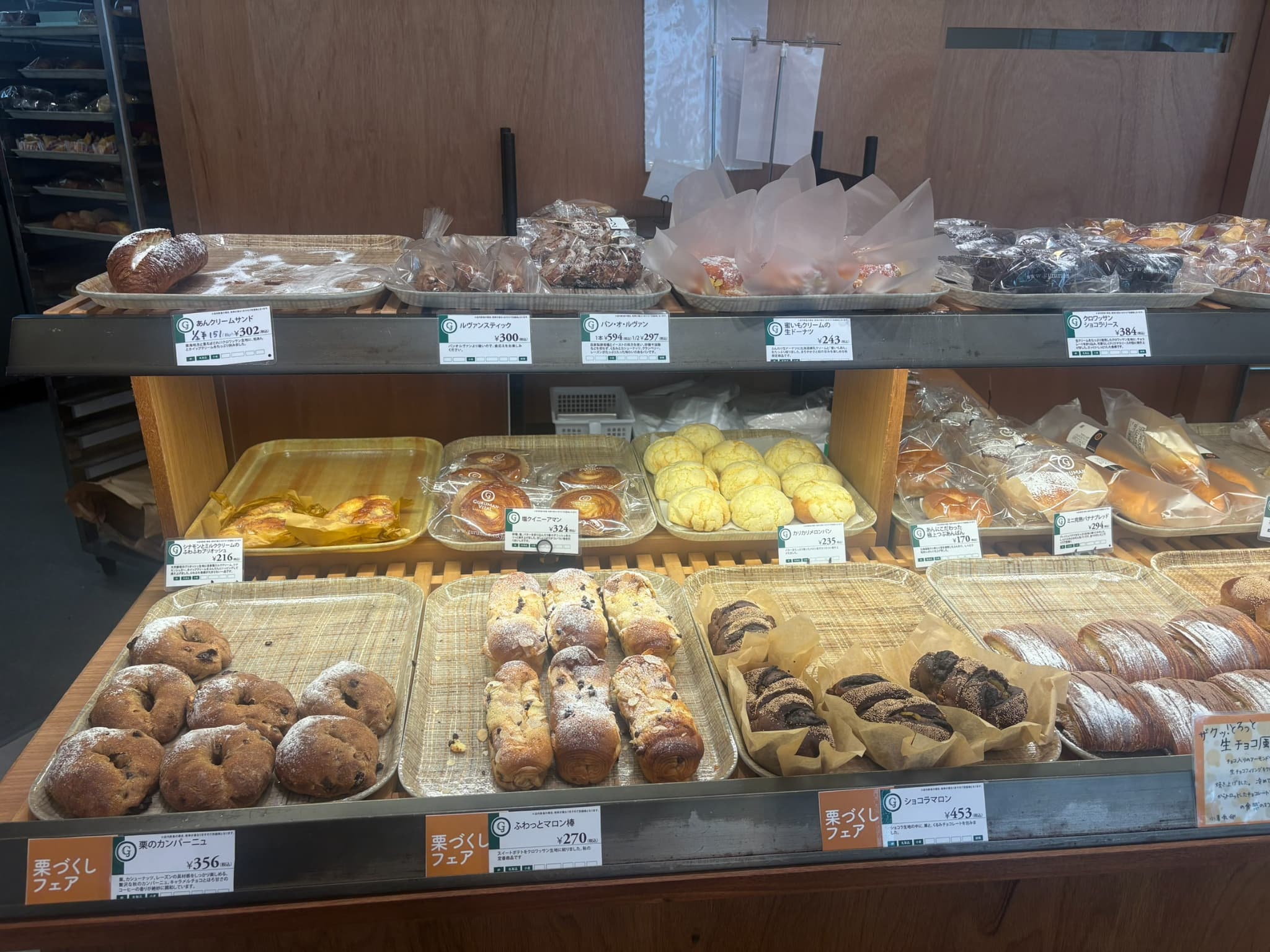 食パンやサンドウィッチ、菓子パン、惣菜パン、バケットなど種類が豊富で、他に季節限定の素材を使ったパンも並んでいました。