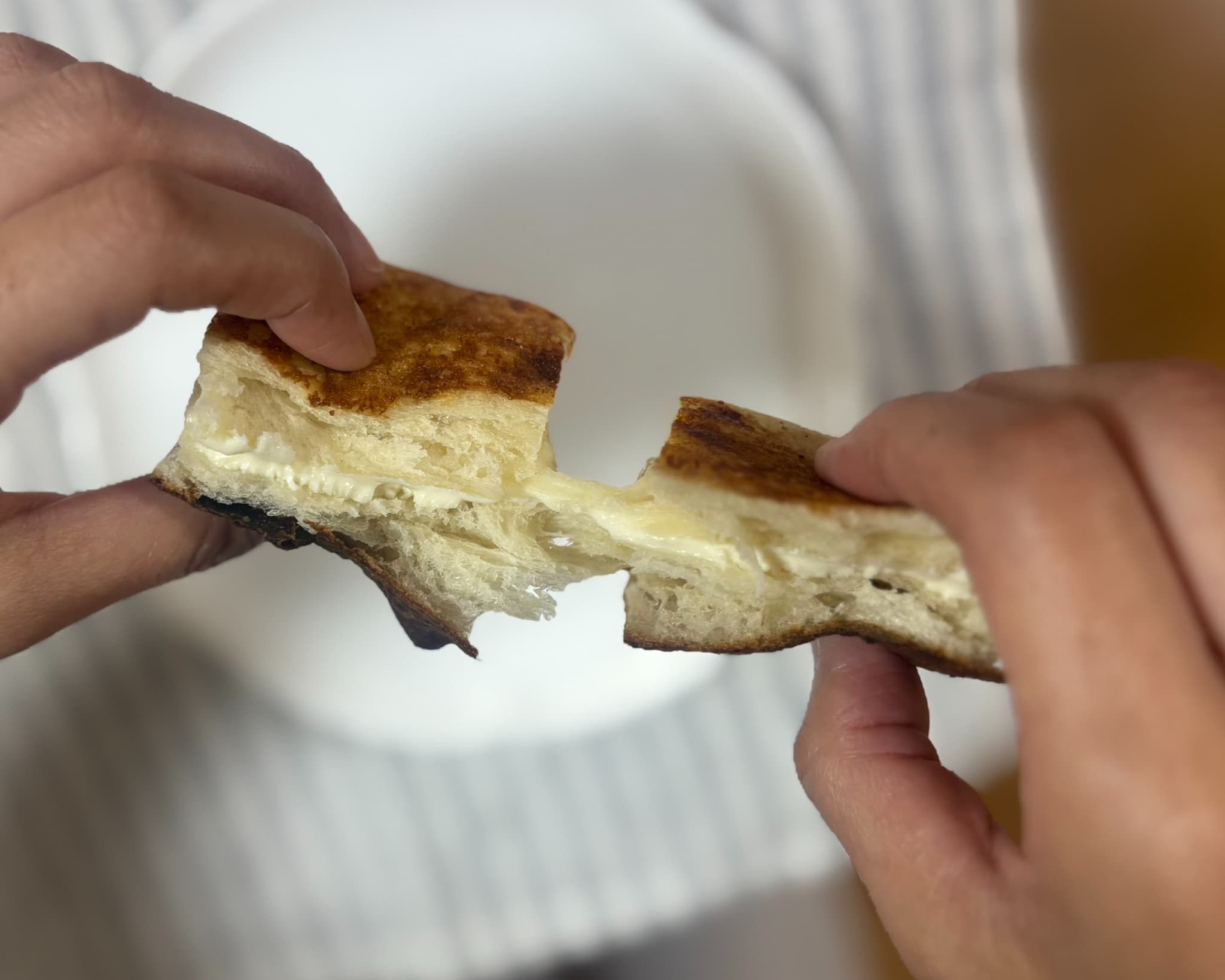 チーズは伸びるくらいもちもち!外はカリッと香ばしいのに、中はもちもちな不思議な食感が楽しめます。そしてチーズの旨味がしっかり感じられます。