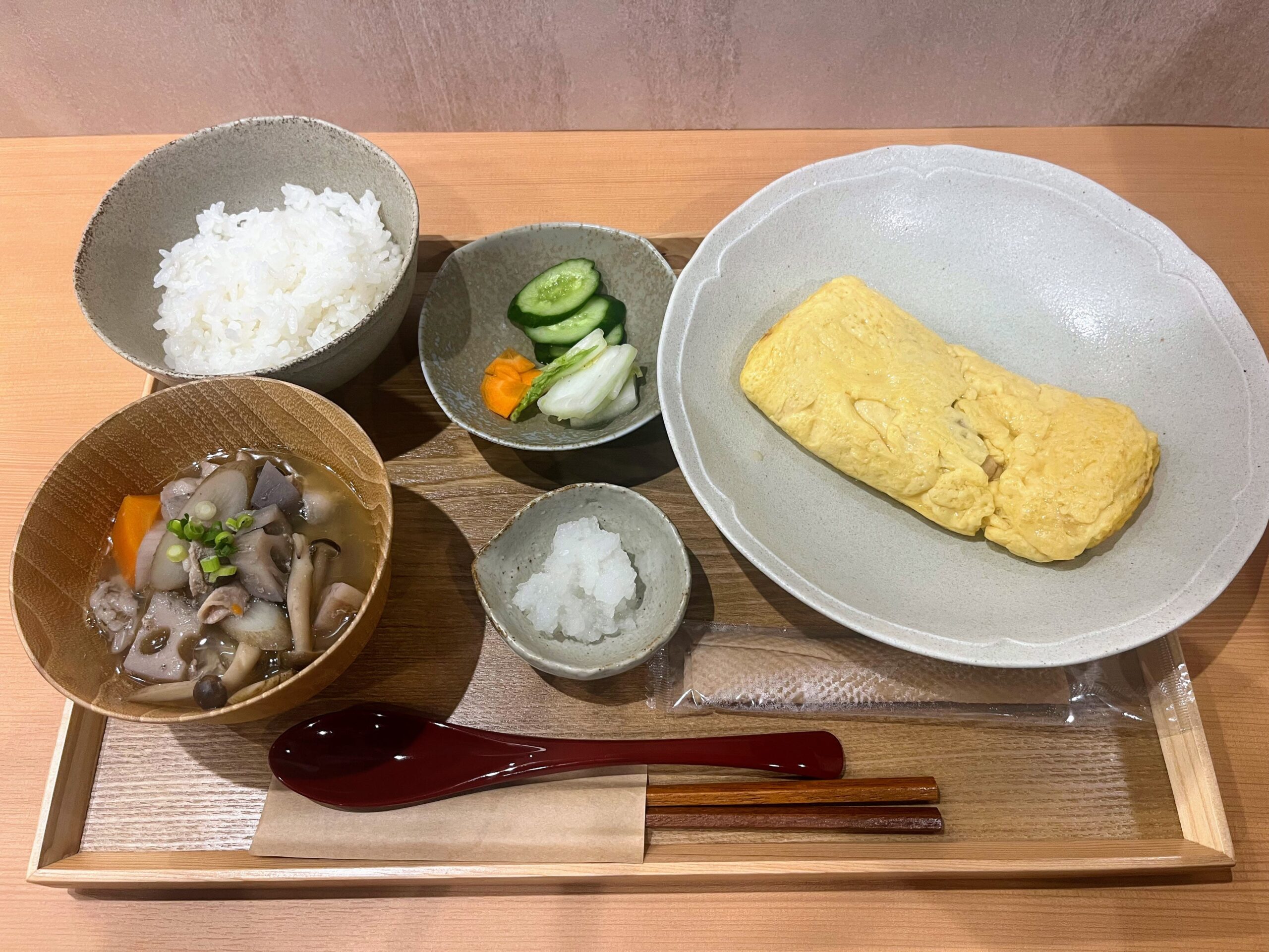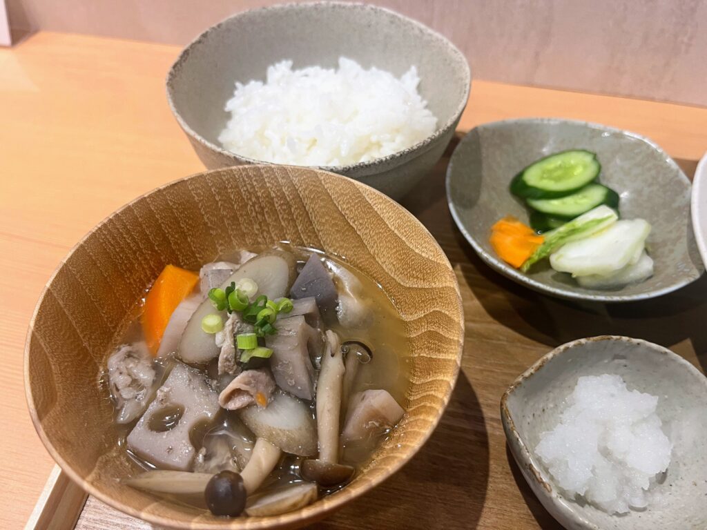 さらに、自家製出汁を使った具だくさんの豚汁は、旨味がしっかり感じられる優しい味わい。自家製のお新香はさっぱりとしていて、箸休めにぴったりです。少し辛みのある大根おろしと一緒に食べれば、味変も楽しめます。