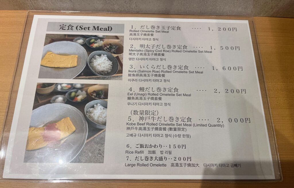 定番のだし巻き玉子定食に加え、明太子は丸ごと1本をだし巻き玉子に巻き込んで提供されます。その他の具材、いくら・鰻・神戸牛は、だし巻き玉子の上にのせて提供されるため、ご自身で味変しながら楽しめるそうです。