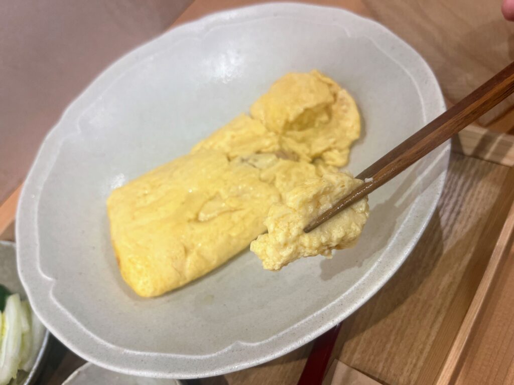 焼きたてのだし巻き玉子に箸を入れると、ジュワッと出汁があふれ出し、ふわふわの卵と合わさって口いっぱいに広がる幸福感。ここまで軽やかで柔らかなだし巻き玉子は、まさに職人技そのものです。