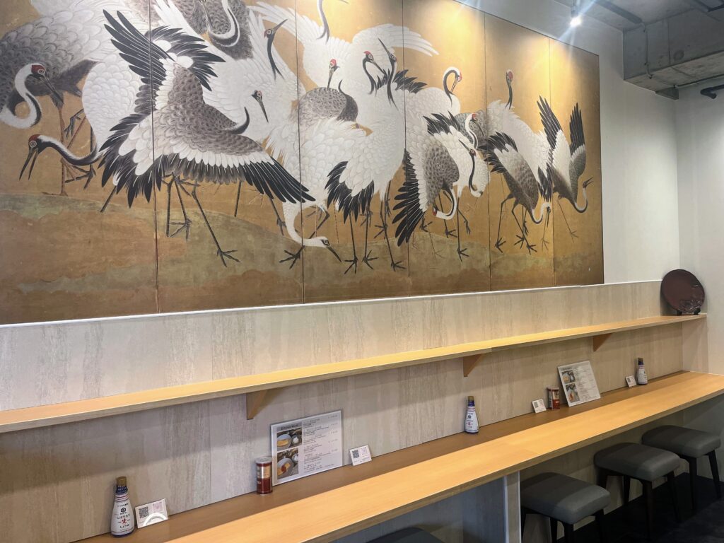 壁には大きな日本画が一面に飾られており、菖蒲絵や屏風が好きだという店主が厳選した、このお店の象徴ともいえる作品。さらに、鎌倉らしさを感じられる鎌倉彫も飾られ、落ち着いた上質な雰囲気を引き立てています。