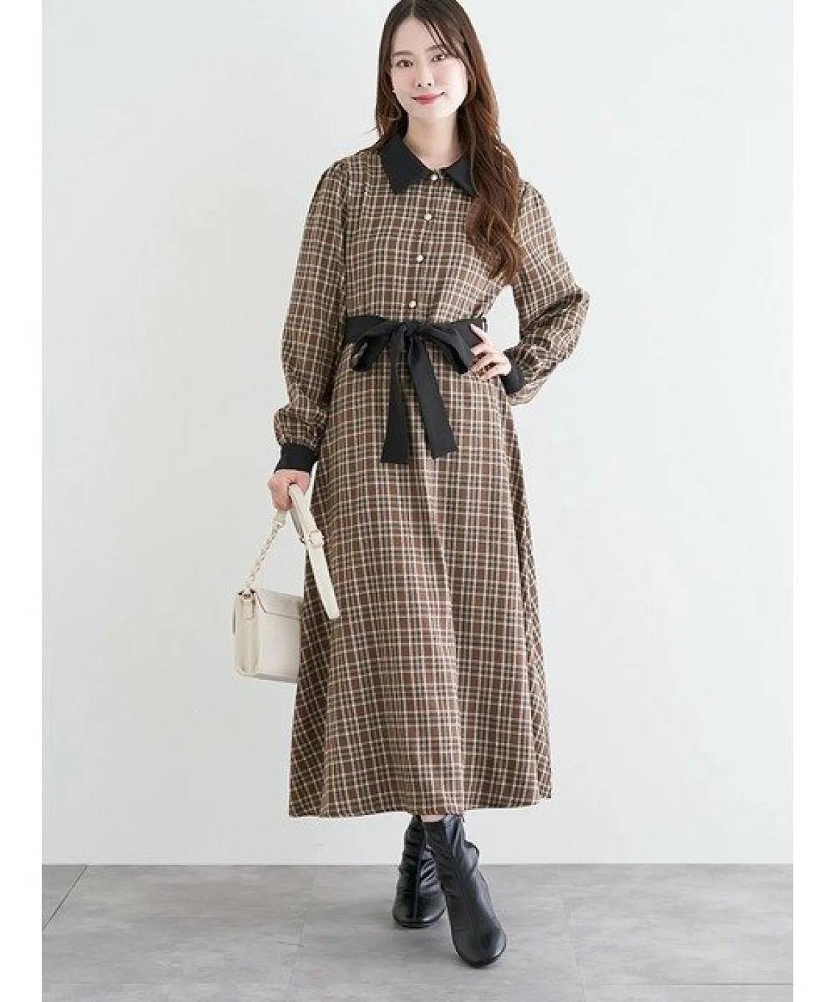 シックなカラーのチェック柄ワンピースは、2025年秋に着るのにぴったり♪
