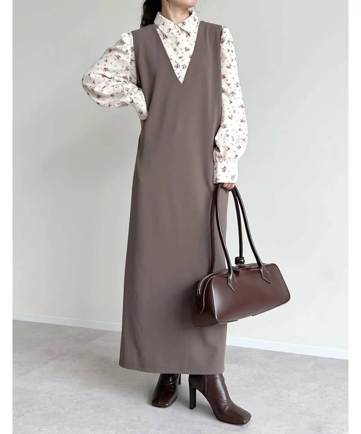 深めVネックデザインのワンピースは、すっきり見えする&着ぶくれしにくいところが◎