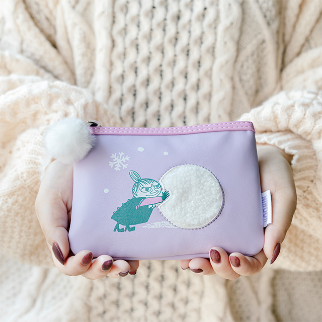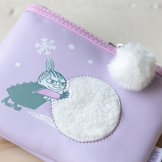 冬らしいラベンダーカラーを基調とし、雪玉を転がすリトルミイが愛らしくあしらわれたポーチです。まんまるの雪玉を思わせるフォルムや、ふわふわのポンポンチャームが魅力的なアクセントとなっています。メイク小物や身の回りのアイテムを整理するのに適しており、同シリーズのファーバッグと組み合わせることで、より一層冬の気分を味わえます。フラットタイプとラウンドボアタイプがあります。