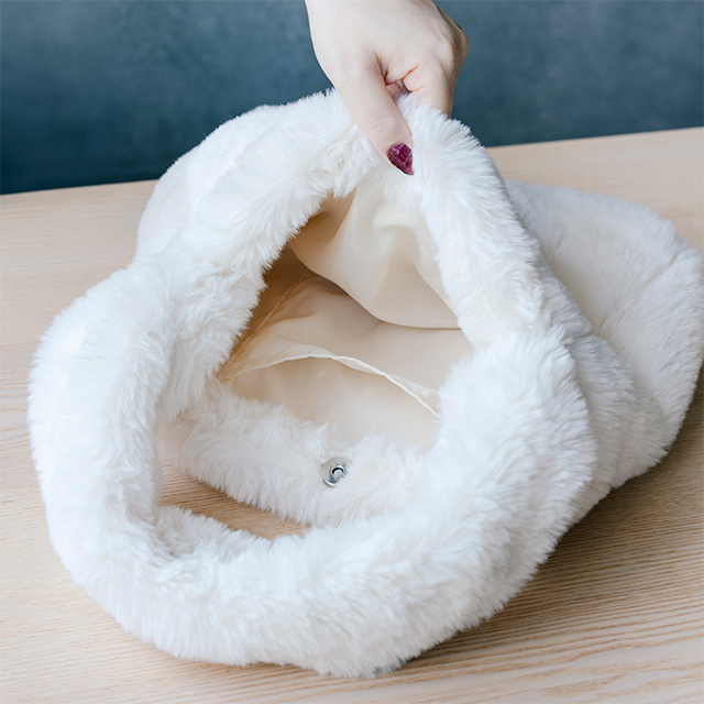 ふんわりとしたフェイクファーを贅沢に使用したトートバッグです。やわらかなアイボリーカラーはコーディネートに自然に馴染み、持つだけで秋冬らしい温もりを添えます。肩に掛けるとシルエットはすっきりとまとまり、収納力も十分に備わっているため、普段使いに最適なアイテムです。