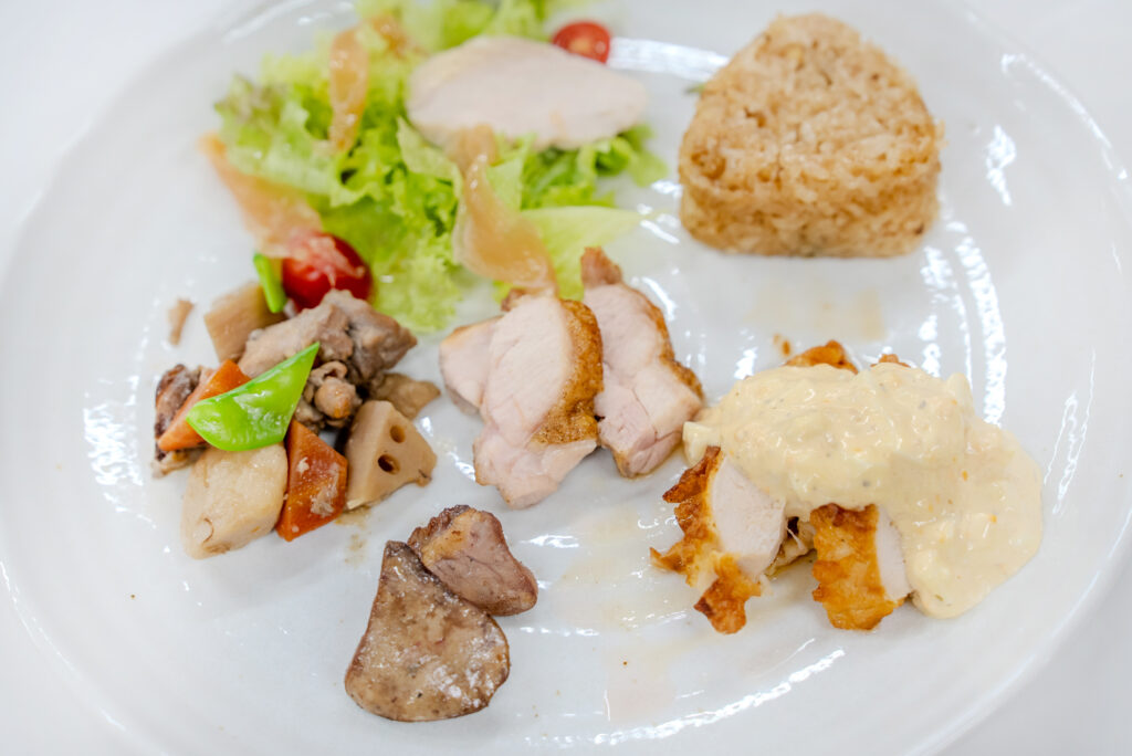 皿の上に盛り付けられたのは、がめ煮(もも肉)、鶏南蛮(胸肉)、もも肉のソテー、中心はレアに仕上げたレバーのソテー、鶏生ハムとチキンハムのサラダ、冷凍食として販売しているかしわめしのおにぎりなど。