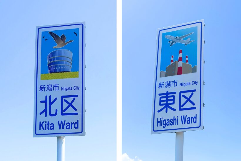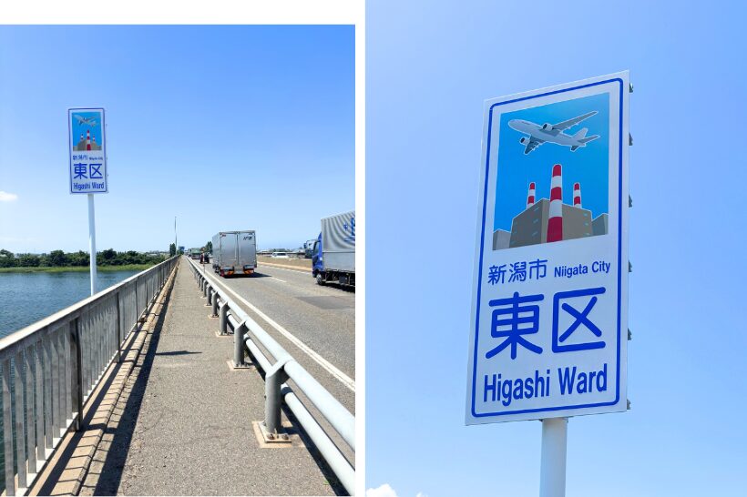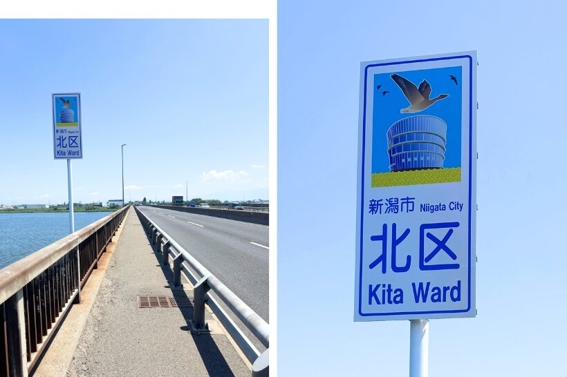 新新バイパス上の阿賀野川大橋にある北区と東区の境に、区名と区の特色を示すイラストを描いた看板「カントリーサイン」が7月31日に設置された。新潟市8区の魅力のさらなる創造・発信を目的としている。