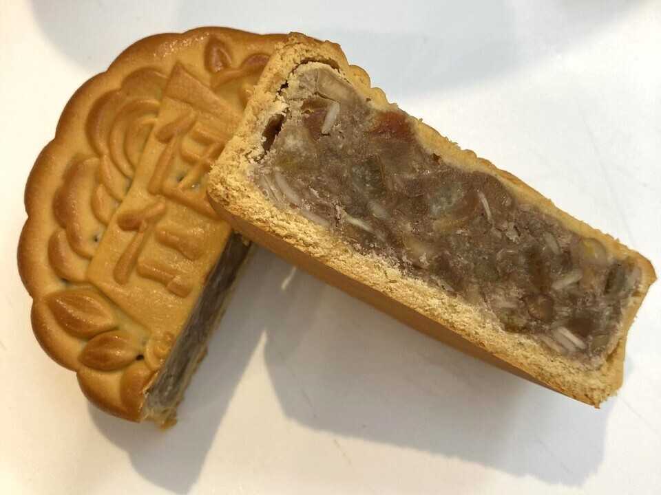 左から廣記商行、重慶飯店、中華面食の五仁月餅の切り口