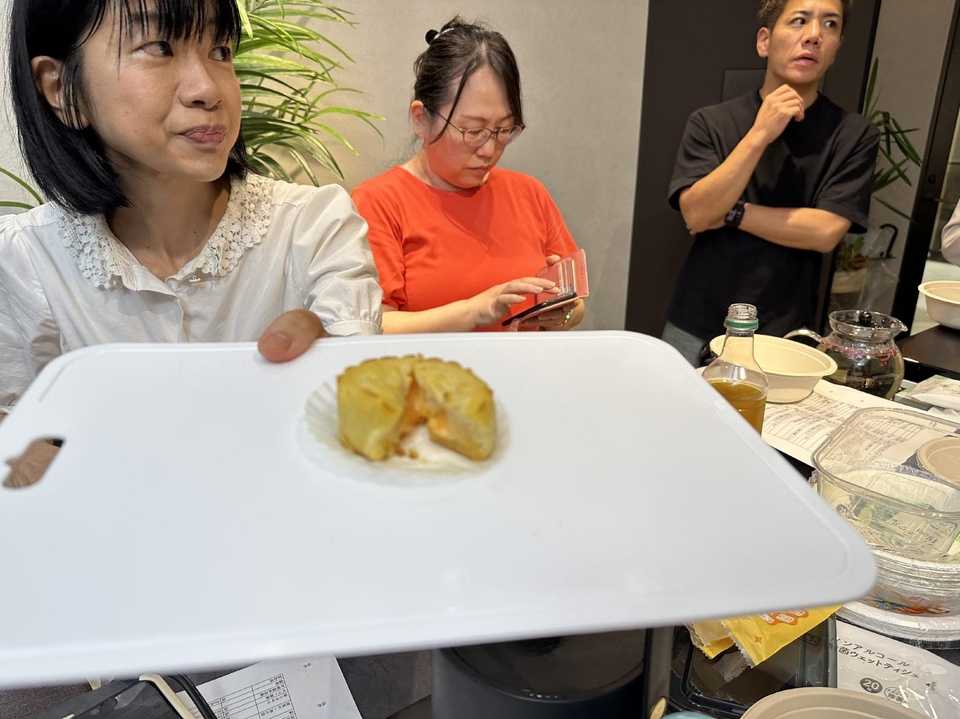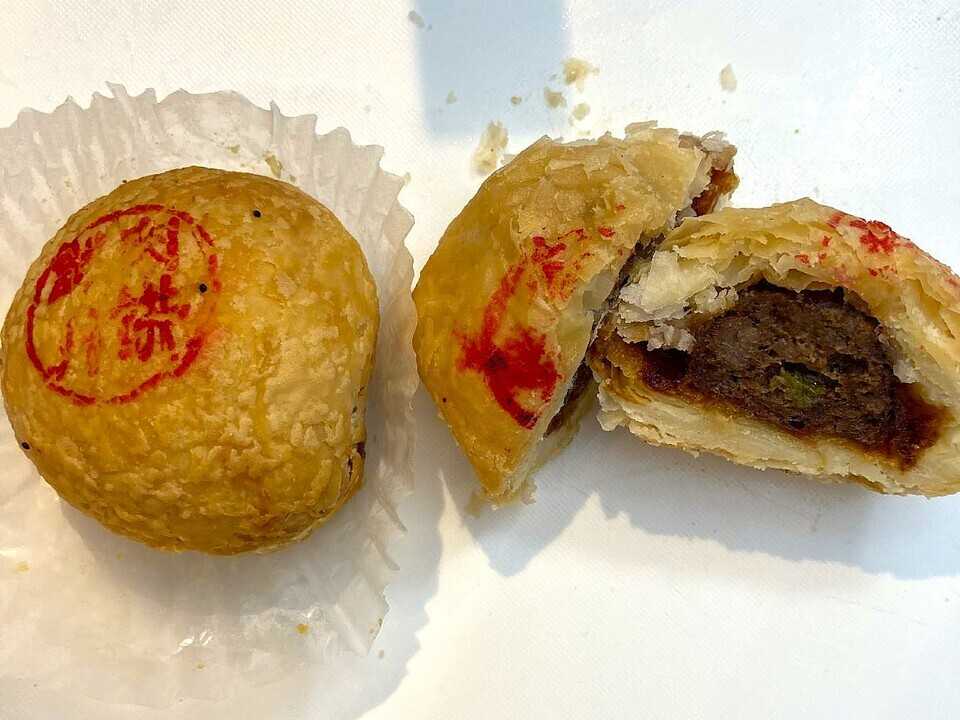 また、多賀井さんは池袋「永祥生煎館」の「肉月餅」と呼ばれる、パイ生地の中に肉まんの中身が入っているものを持ってきました。これはフライパンで焼いて食べます。ジューシーで、甘いものが苦手な人でも食べられるのと、私たちには甘い月餅の箸休めになってちょうど良かったです。