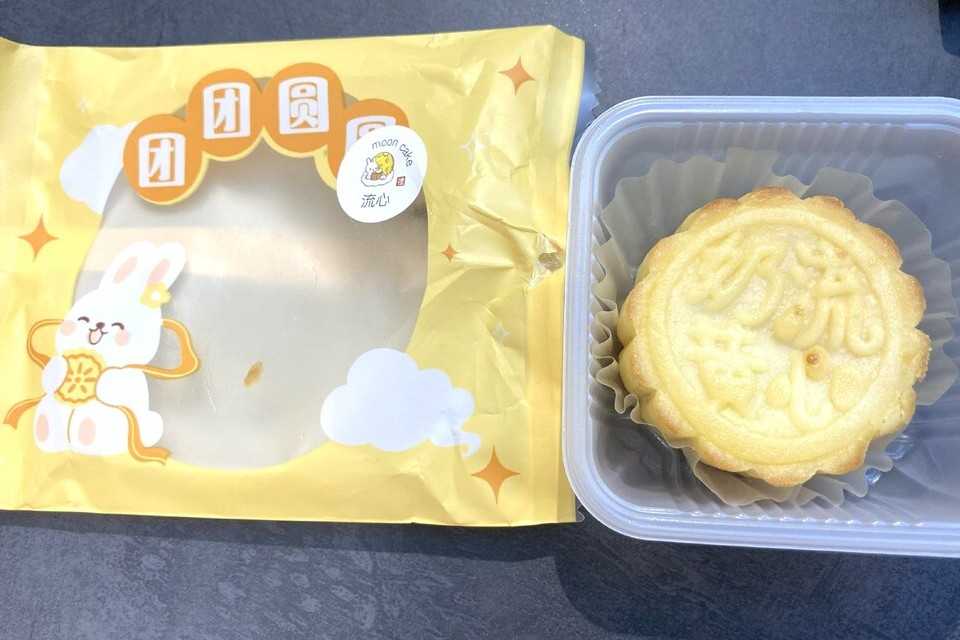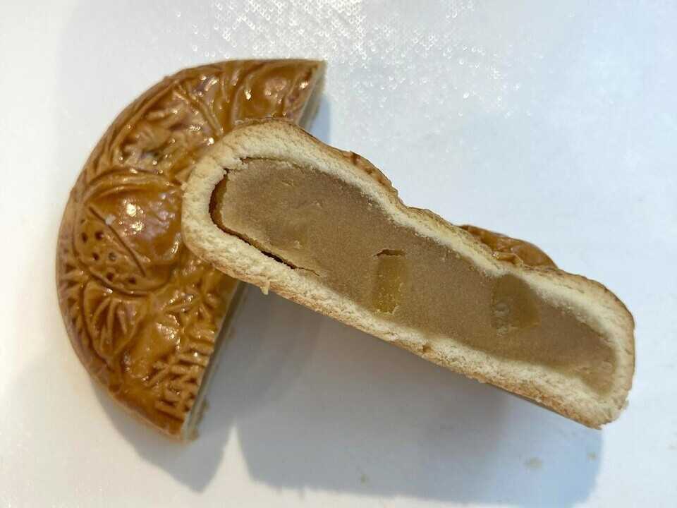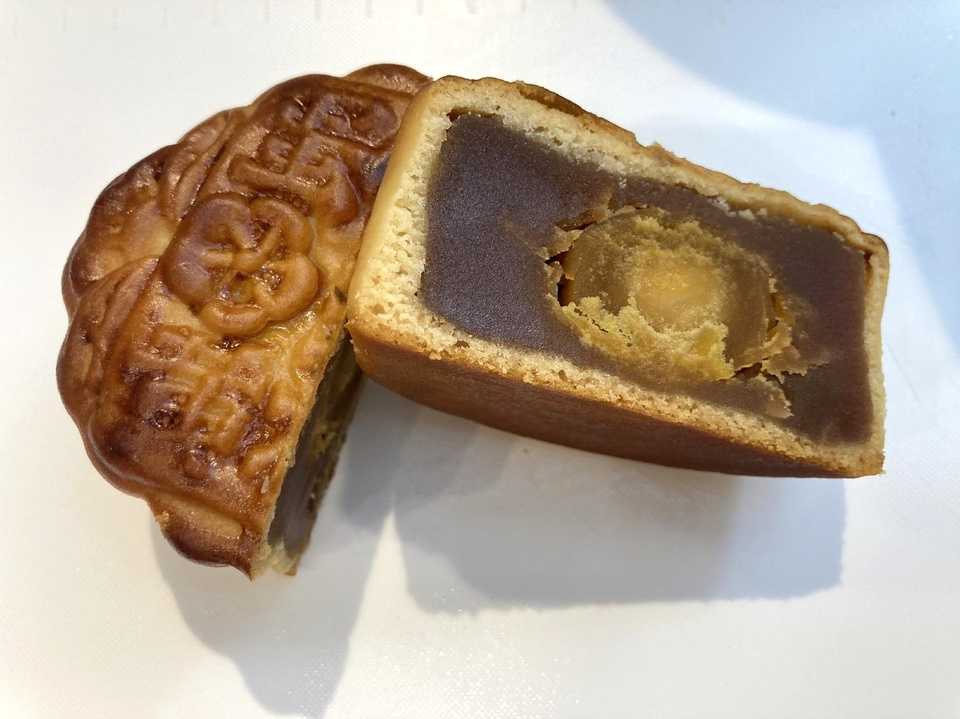 こちらは都内北区にある「李百萬」の「流心月餅」。レンジで5秒温めてから切ると、クリーム状の中身が溶けて出てきます。何種類かありますが、今回はココナツ風味のものです。