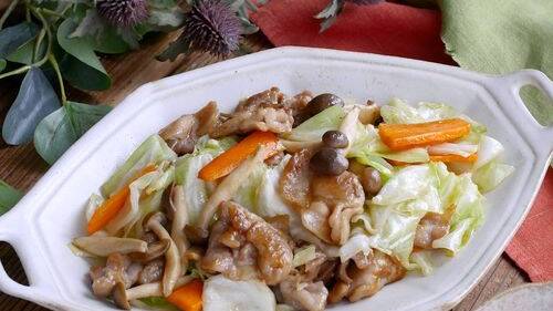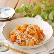 5: しめじを加えてしんなりするまで炒めたら、ゆで汁を加えてさっと炒めます。