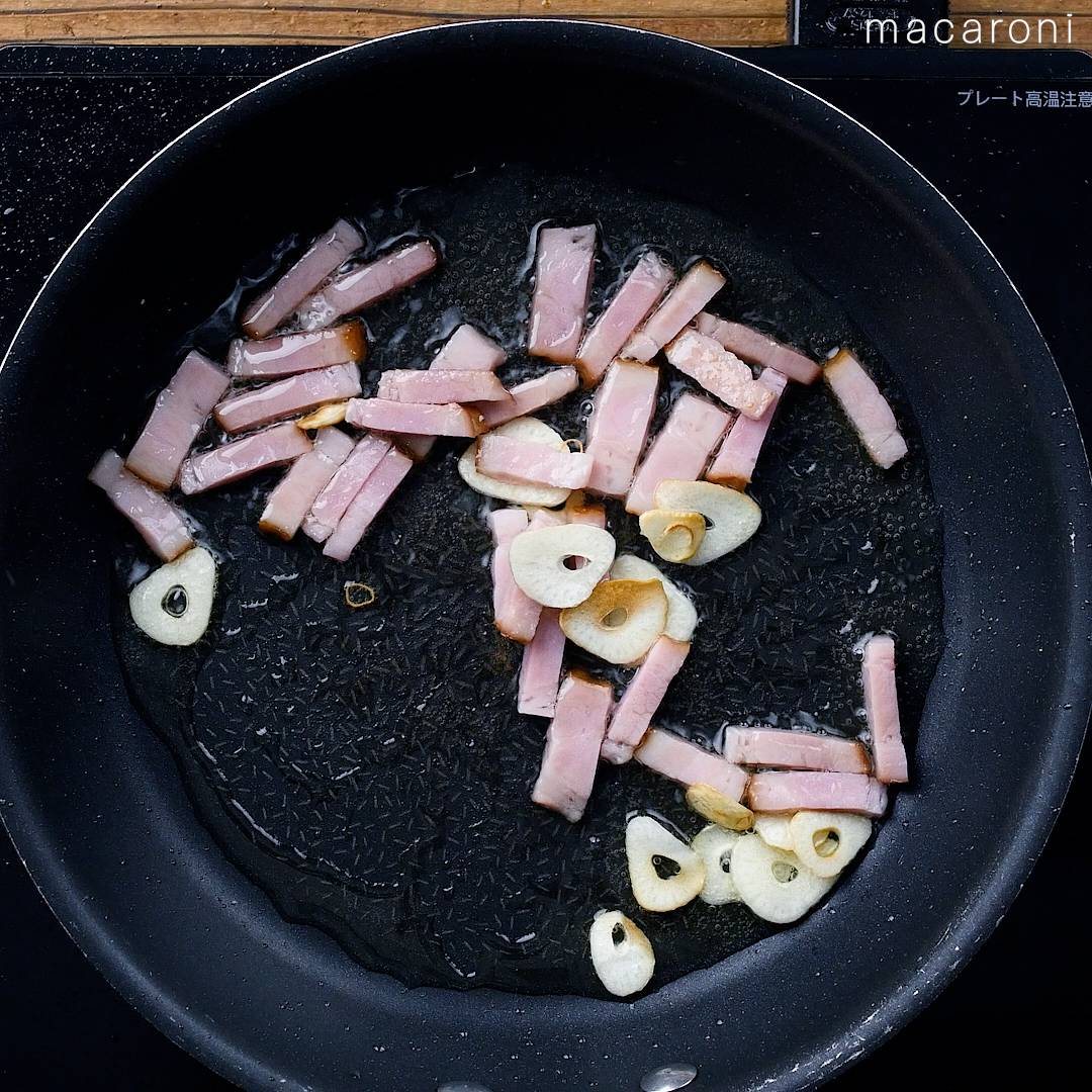 4: ベーコンを加えてうっすら焼き色がつくまで炒めます。