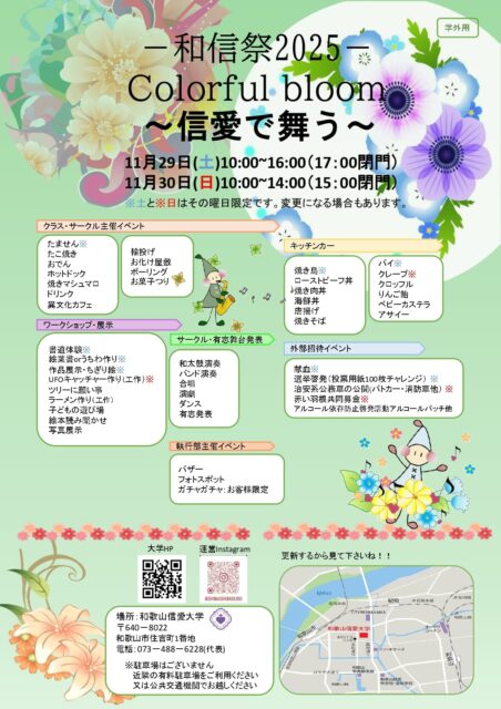 和歌山信愛大学の学園祭「和信祭」。2025年のテーマは「Colorful bloom(カラフルブルーム)~信愛(ここ)で舞う~」。サークルや有志によるステージ発表や出店、ワークショップなど、小さい子どもから大人まで楽しめるお祭りです。