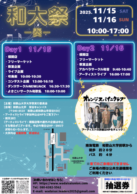 和歌山大学の学園祭「和大祭」。今年のテーマは「奏」。学生たちによる模擬店や屋内・屋外企画などが目白押し!