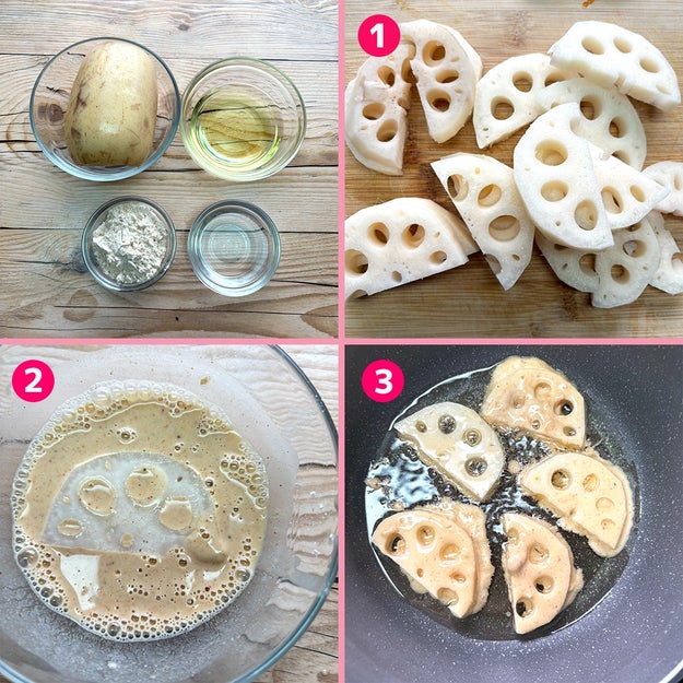 ① れんこんは皮をむき、薄い半月切りにして水にさらす。5分おいて水気を拭き取る。