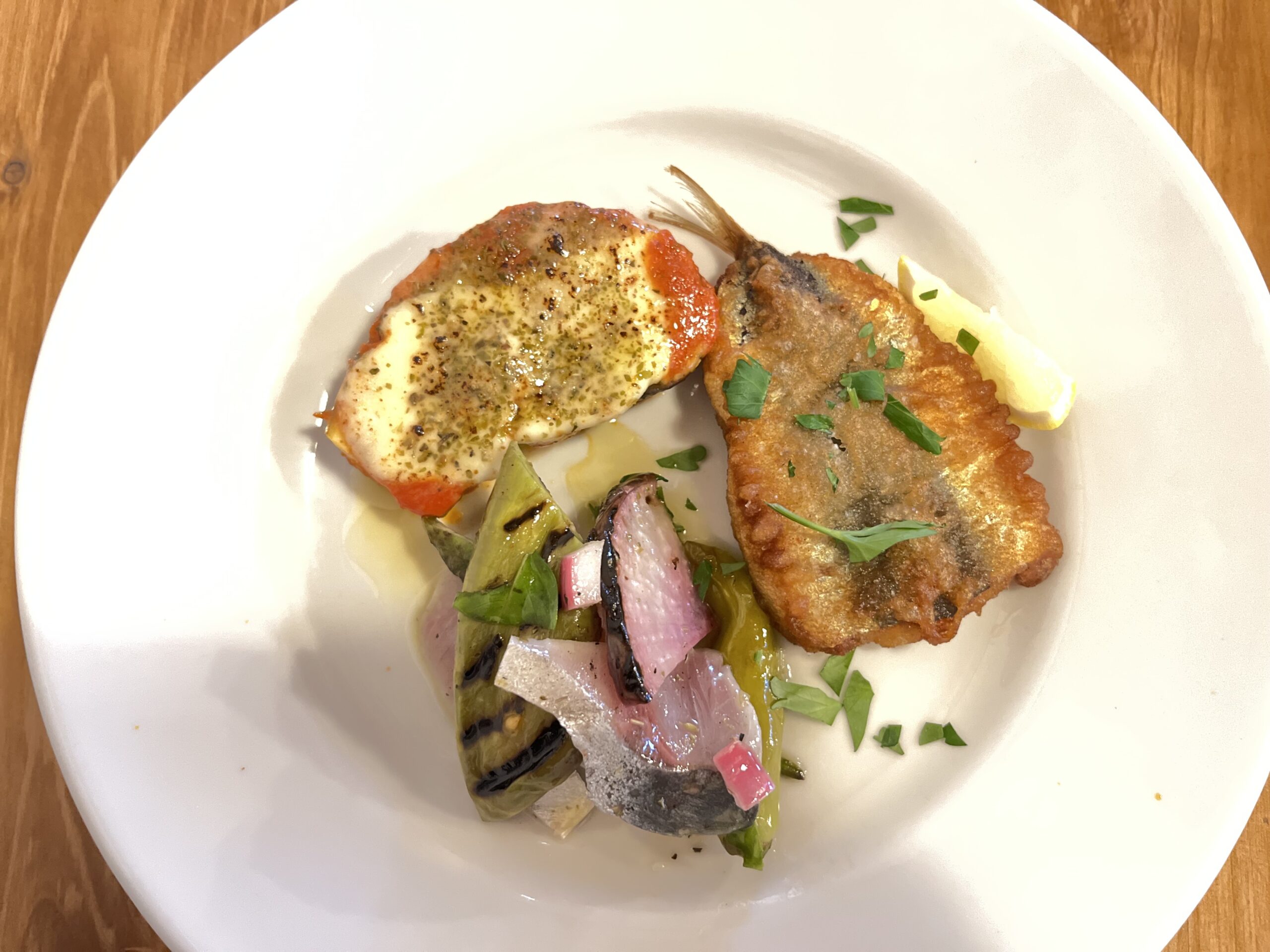 前菜は、ナスとモッツァレラ、トマトのオーブン焼き、ウルメイワシのフリット、鯵とグリル野菜のマリネが並び、彩りと盛り付けのバランスがよく、ひと目で食欲が湧いてきます。
