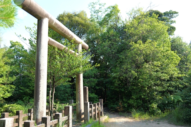 社務所でいただける道順が書かれた案内や、道中の看板に従って進むと、伊勢の方向を向いて静かに佇む鳥居が現れます。昔は、伊勢神宮まで足を運ぶのが難しかった人々が、この場所で伊勢の方角に向かい祈りを捧げたのだそう。