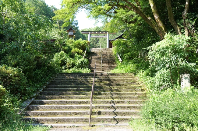しばらく坂道を歩き、境内入口の鳥居に到着です。階段の手前には、参拝者用の駐車場が5~6台分あるので、車での参拝も可能◎ 周辺は道幅が狭いので、通行の際は十分ご注意くださいね。