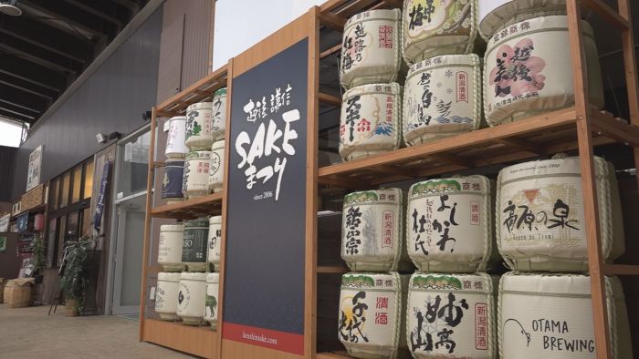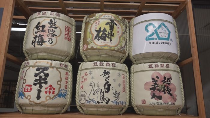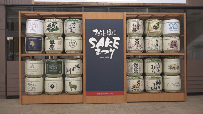 今週末に開催される越後・謙信SAKEまつりの開催20周年を記念したフォトスポットが本町4丁目のイレブンプラザにお目見えしました。日本酒のほかワインやビールなどSAKEまつりに参加する地元の21の銘柄の樽が勢ぞろいしました。