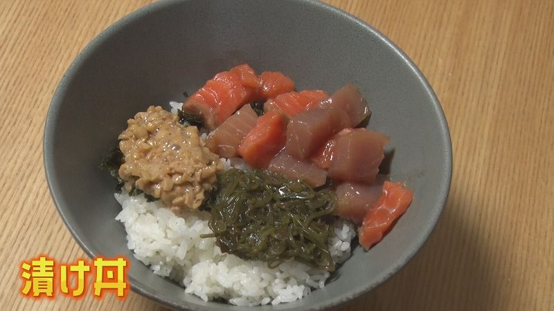 先ほどの買い物で購入したサーモンとマグロを使った漬け丼!