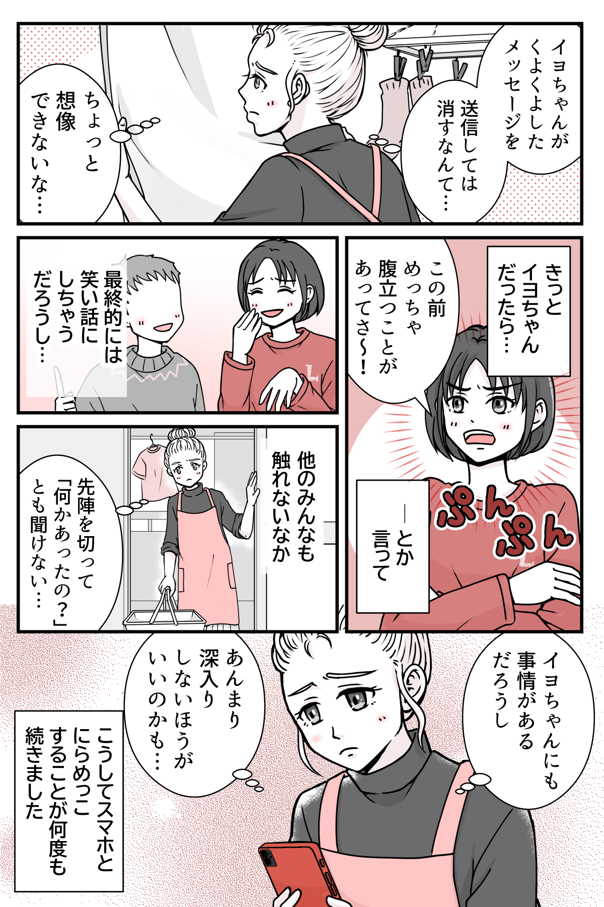 幼稚園で出会った私たちは、子どもたちがバラバラになった今でも変わらず仲良しです。LINEグループでの交流もいまだにありますし、みんなで相談しあったり近況報告をしあったりするのも楽しいです。 しかし、だからこそイヨちゃんの送信取消だけがどうしても気になってしまいます……。ですがイヨちゃんのキャラクターからすると、気弱なメッセージを消しているのも想像できません。 他のみんなもとくに言及していないことですし、気にはなるのですが、私も深入りしないほうがいいのかもしれません。