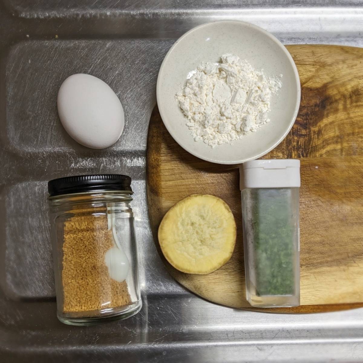 容器で、溶き卵・冷水・コンソメの素・ドライパセリを混ぜます。