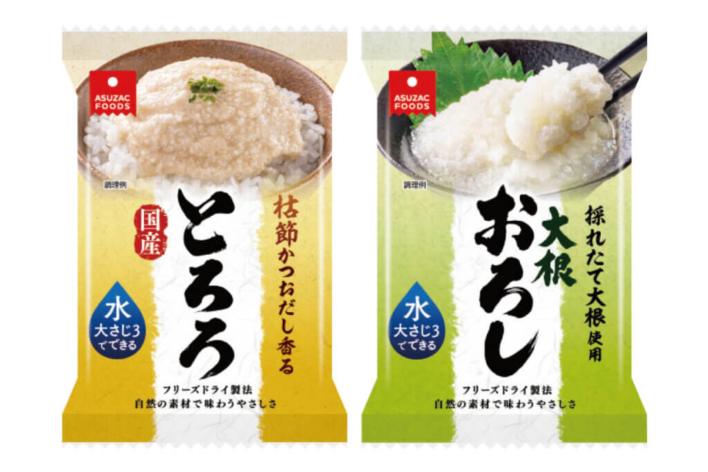 アスザックフーズが誇るフリーズドライ商品から、厳選したナガイモを使った「国産長芋とろろ」と、自社農園で育てる大根をすりおろした「大根おろし」を1食ずつプレゼント。どちらも水をかけるだけで新鮮な味わいを楽しめて、すりおろす手間がないのが魅力。まるでおろしたてのような豊かな風味を堪能して。