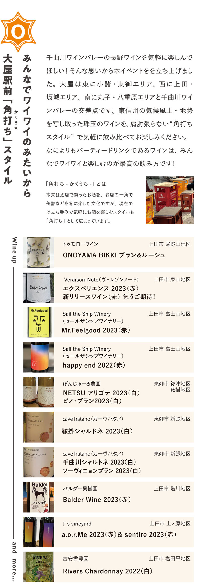 東に小諸・東御エリア、西に上田・坂城エリア、南に丸子・八重原エリアが広がる千曲川ワインバレーのワインを気軽に楽しんでもらうことを目的に、2023年に初開催された『大屋角打ち』。