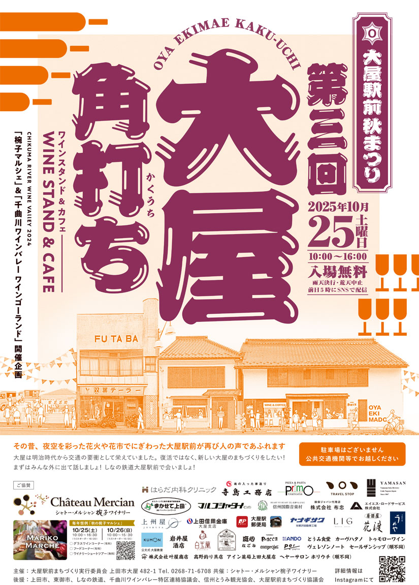 上田市と東御市と丸子地区のちょうど交差点に位置する大屋駅前で、ワイン&珈琲のマルシェ『大屋駅前秋まつり 第3回 大屋角打ち』が、2025年10月25日(土)に開催。