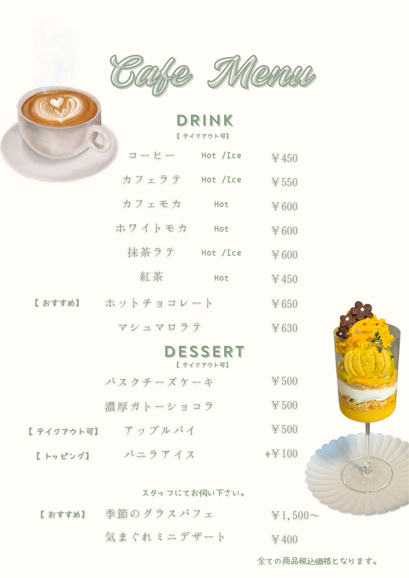 ※ランチ・カフェ・テイクアウト・パフェ販売・クリスマスケーキ販売など、日時により提供メニューや営業形態が異なります。おでかけの前にInstagramでご確認ください