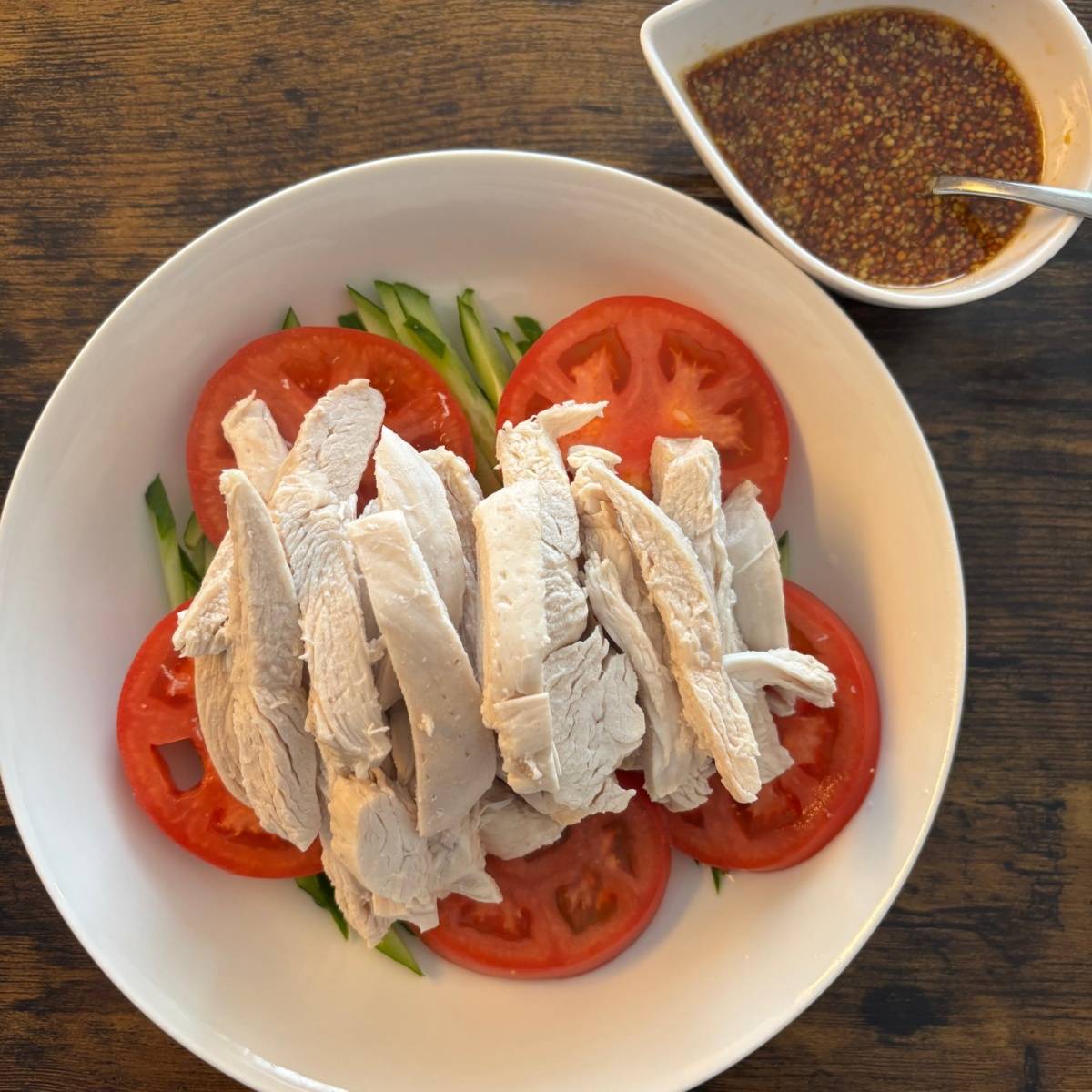 器にきゅうり・トマトを盛り付け、その上に1cm幅に切った②の鶏むね肉をのせます。