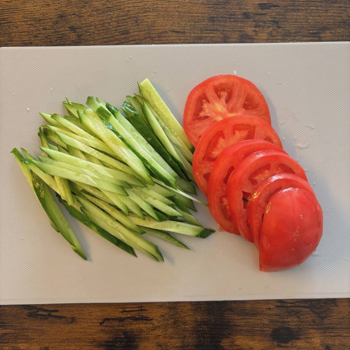 きゅうりは細切り、トマトは輪切りにしておきましょう。